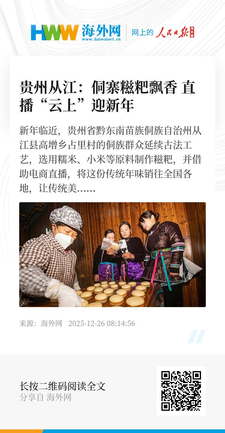 新年临近,贵州省黔东南苗族侗族自治州从江县高增乡占里村的侗族群众延续古法工艺,选用糯米、小米等原料制作糍粑,并借助电商直播,将这份传统年味销往全国各地,让传统美食搭乘“数字快车”走出大山。图源:视觉中国
