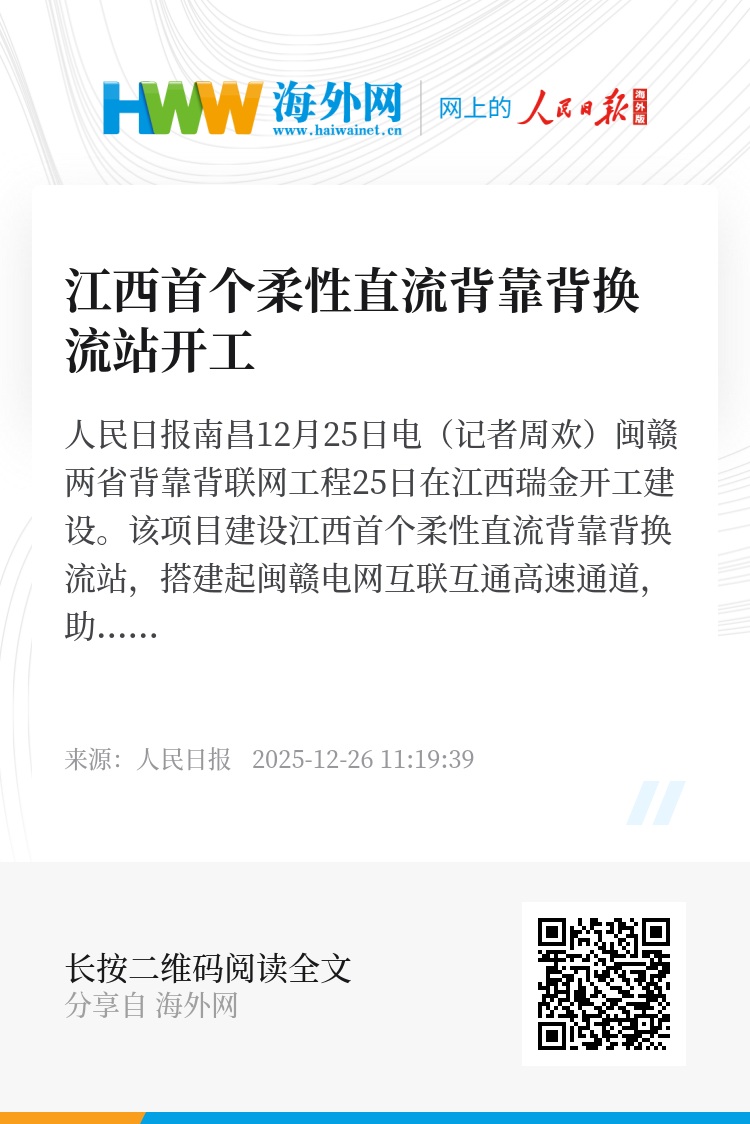 人民日报南昌12月25日电(记者周欢)闽赣两省背靠背联网工程25日在江西瑞金开工建设。该项目建设江西首个柔性直流背靠背换流站,搭建起闽赣电网互联互通高速通道,助力区域能源资源优化配置和新能源高效开发利用。