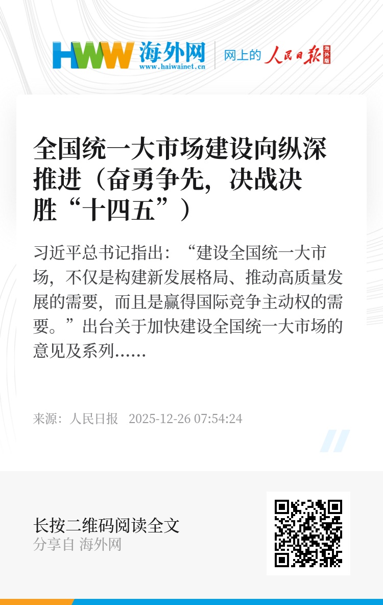 乘势而上、接续推进。“十五五”规划建议明确提出“超大规模市场优势持续显现”等经济社会发展的主要目标,中央经济工作会议强调“纵深推进全国统一大市场建设”。认真贯彻落实习近平总书记重要指示精神和党中央决策部署,纵深推进全国统一大市场建设,必将有效畅通我国经济循环,进一步激发超大规模市场优势潜力,持续增强经济发展内生动力和活力。(记者 林丽鹂 杨文明 姚雪青)