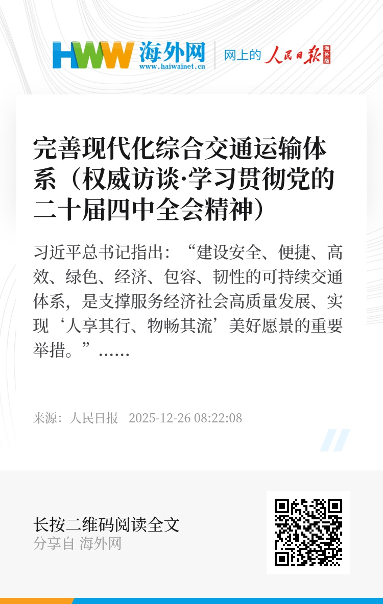 刘伟:完善现代化综合交通运输体系是以交通运输现代化服务保障中国式现代化的战略任务。“十四五”时期,我国综合交通运输体系建设实现了突破性进展,为加快建设交通强国奠定了坚实基础。“十五五”时期要乘势而上,加快完善现代化综合交通运输体系,进一步提升交通运输的综合能力、服务品质、运行效率,有力服务保障基本实现社会主义现代化取得决定性进展。