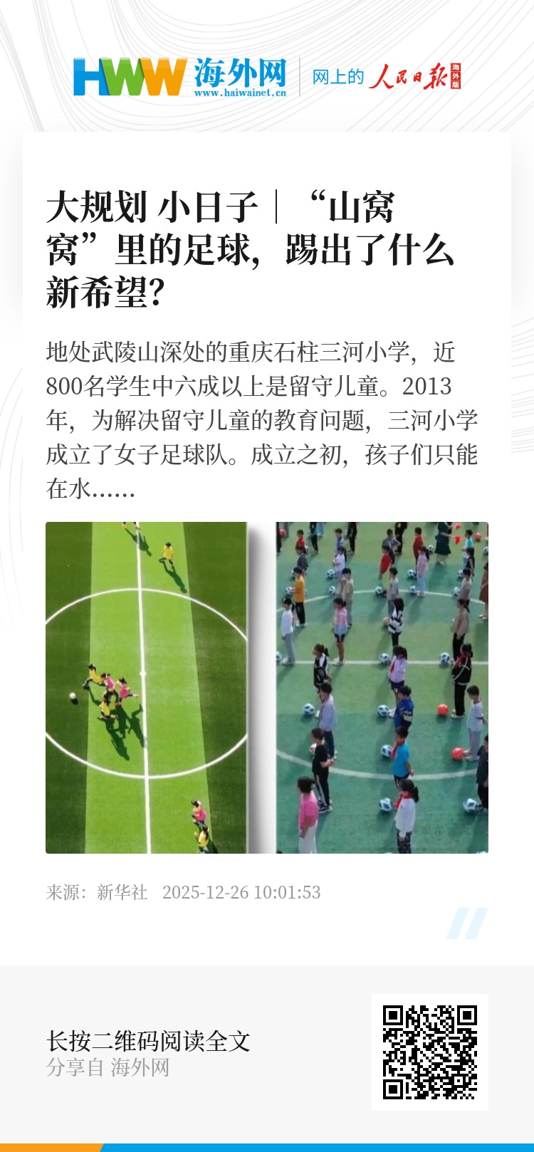 地处武陵山深处的重庆石柱三河小学,近800名学生中六成以上是留守儿童。2013年,为解决留守儿童的教育问题,三河小学成立了女子足球队。成立之初,孩子们只能在水泥地上踢胶球,一场雨,一身汗,一步一脚印。2013年以来,她们获得30余次市级以上比赛冠亚军,首批21名女足队员中,20人通过足球特长考上同济大学、北京体育大学等高校。如今,三河小学有了风雨球场和专业足球教练。越来越多的女孩儿走出大山,奔向属于自己的未来。