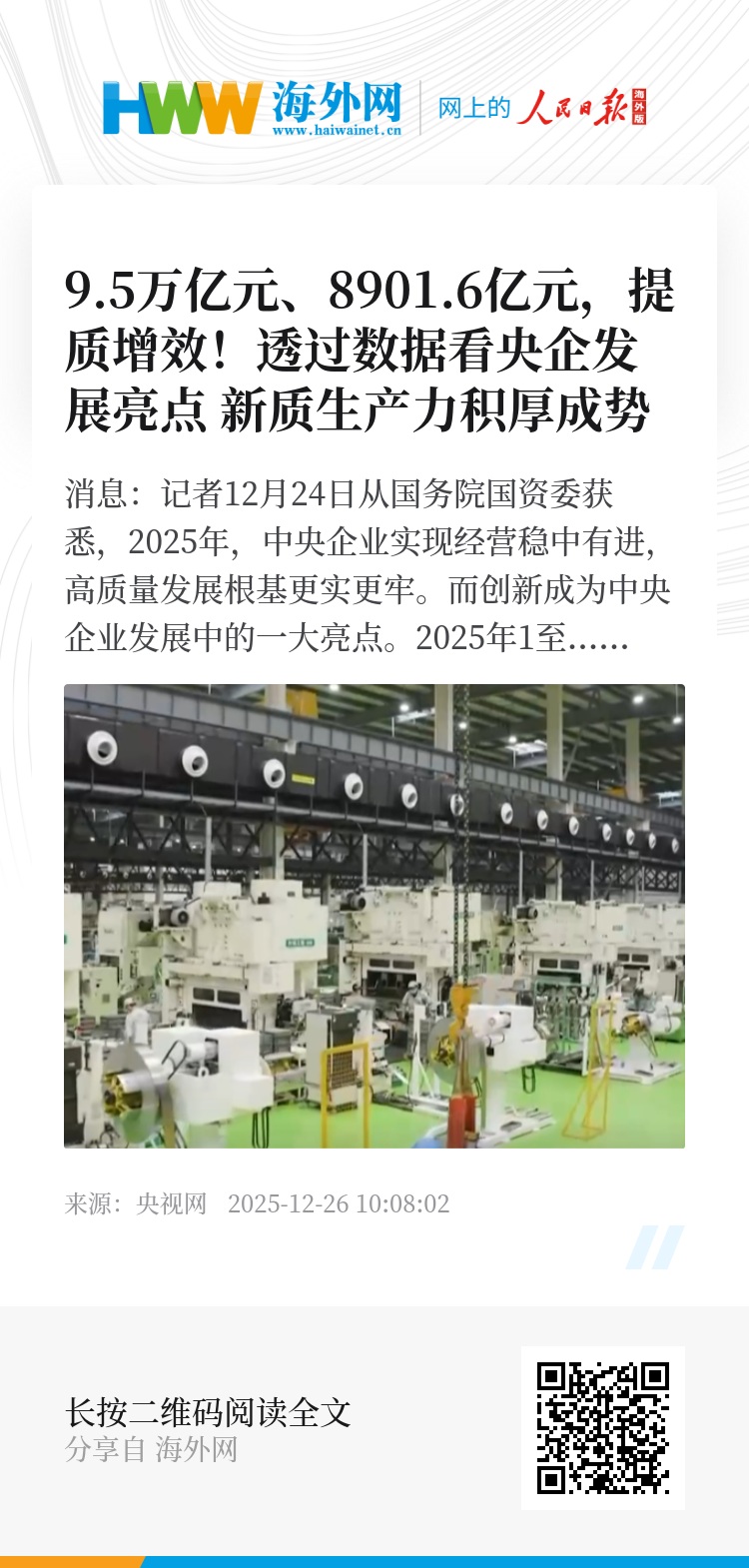 央视网消息:记者12月24日从国务院国资委获悉,2025年,中央企业实现经营稳中有进,高质量发展根基更实更牢。而创新成为中央企业发展中的一大亮点。