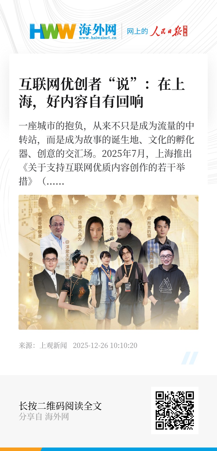 随后,上海市委网信办发起“2025年互联网优质内容创作项目”评选,50件作品脱颖而出。它们背后,是一群来自不同领域、不同背景的“互联网优创者”。他们之中——有城市观察者,有文化传承者,有健康科普者,有科技探索者,有行业洞察者,有创新实验者,还有国际传播者……