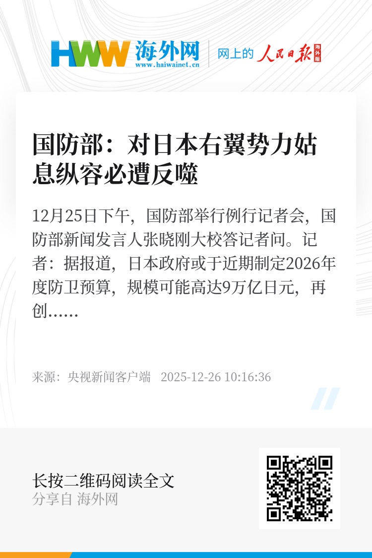 记者:据报道,日本政府或于近期制定2026年度防卫预算,规模可能高达9万亿日元,再创历史新高,将重点发展远程打击能力、推进自卫队编制调整及发展太空作战力量等。请问发言人有何评论?