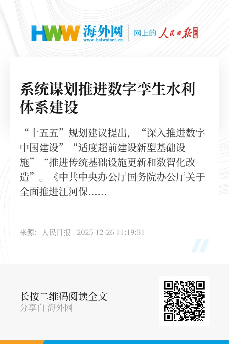 “十五五”规划建议提出,“深入推进数字中国建设”“适度超前建设新型基础设施”“推进传统基础设施更新和数智化改造”。《中共中央办公厅国务院办公厅关于全面推进江河保护治理的意见》明确要求以数字孪生流域为重点,系统谋划推进数字孪生水利体系建设。我们要坚决落实好、完成好党中央、国务院决策部署,谋划好、建设好数字孪生水利体系。
