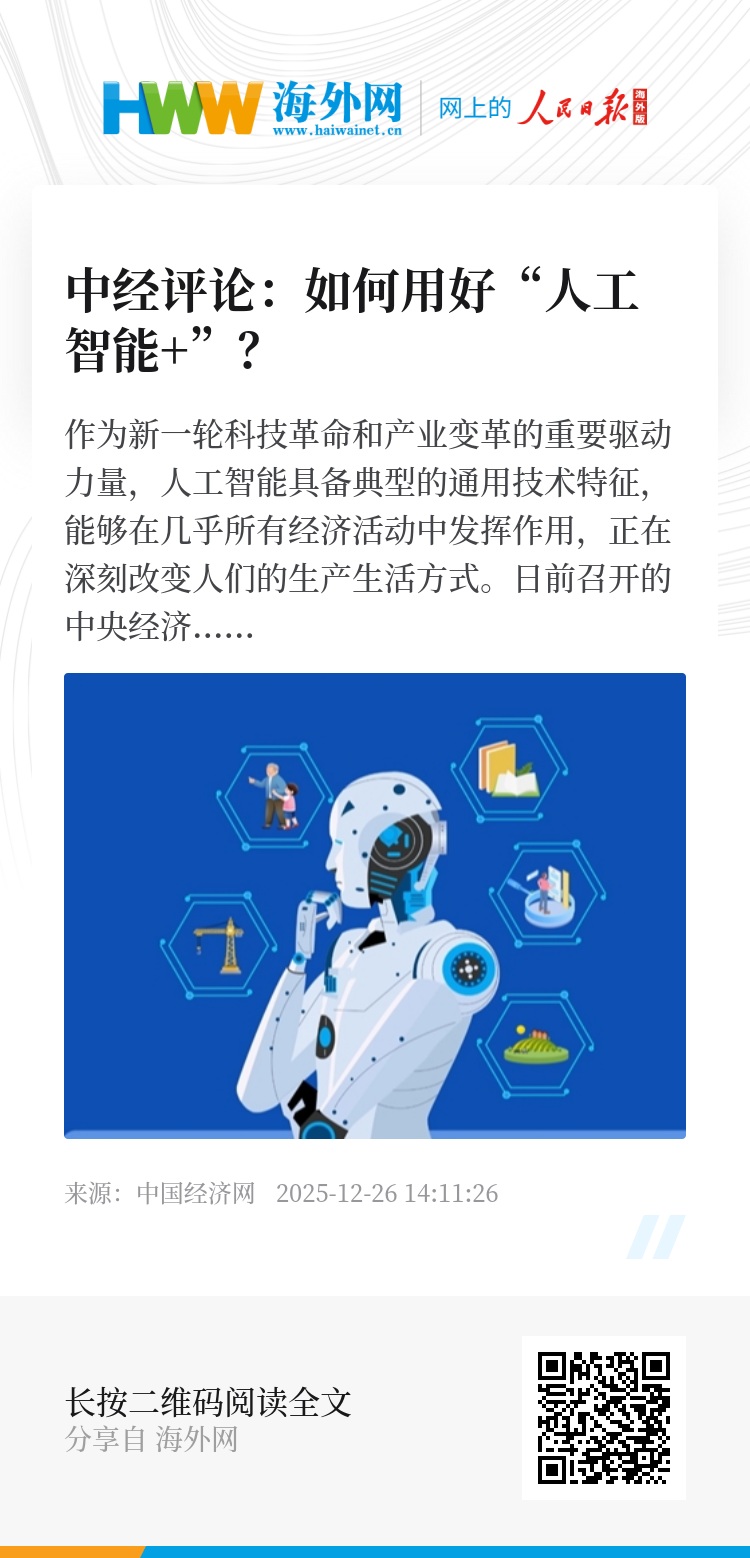 未来世界是什么样的?“人工智能+”或许正在给出答案。而包括企业、政府、社会公众等在内的各方参与者,不妨以更加开放探索的勇气、审慎包容的态度、创新引领的智慧,共同应对“人工智能+”这一新的重要课题。(中国经济网评论员 臧梦雅)