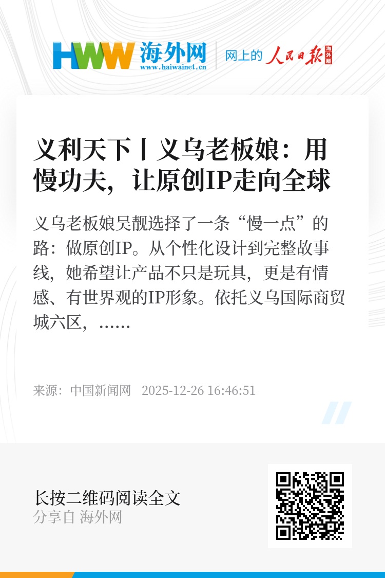 义乌老板娘吴靓选择了一条“慢一点”的路:做原创IP。从个性化设计到完整故事线,她希望让产品不只是玩具,更是有情感、有世界观的IP形象。依托义乌国际商贸城六区,吴靓期待与更多创作者一起,将义乌本土原创品牌推向全球。