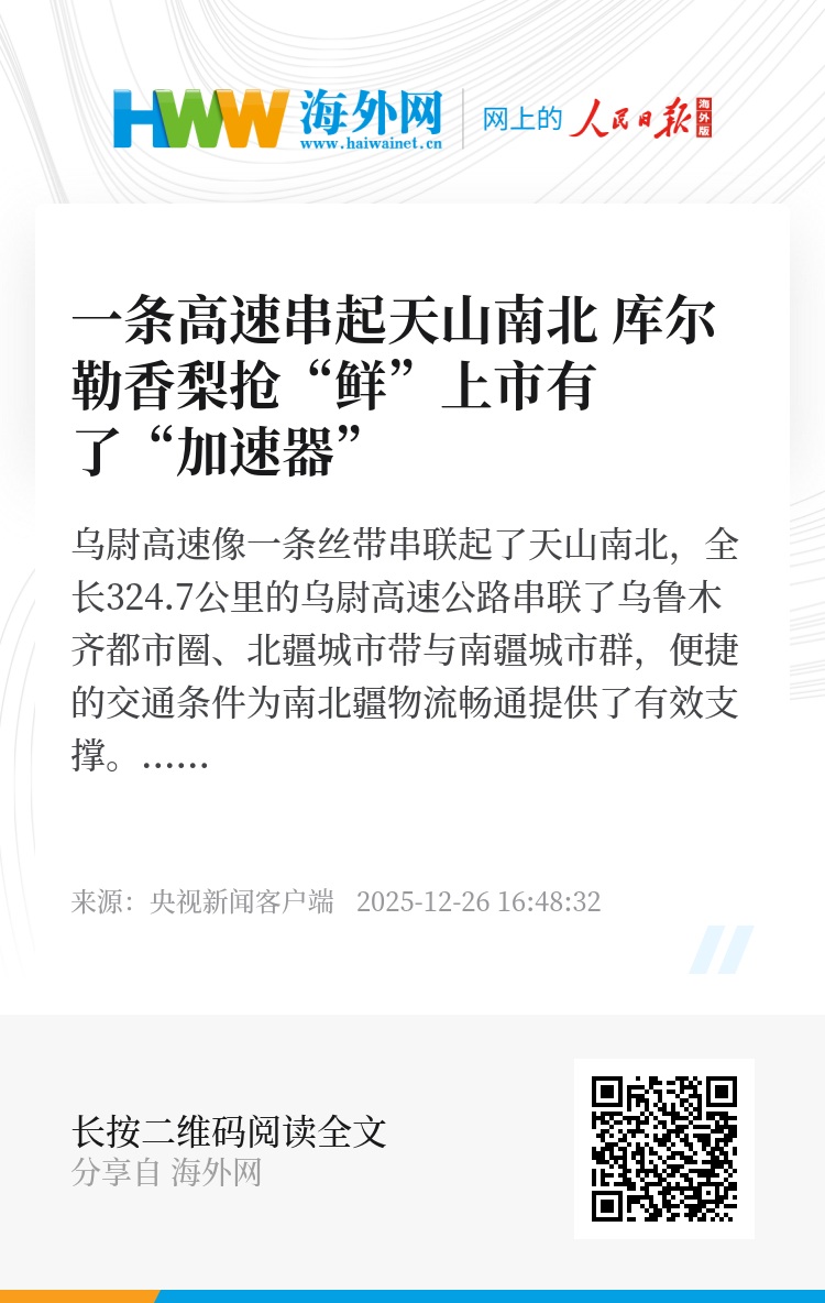 从生鲜果品到板材货物,全长324.7公里的乌尉高速公路通车后,将紧密连接南北疆商贸物流网络,成为沿线物流效率和产业升级的强劲加速器,实现“人享其行,物畅其流”。