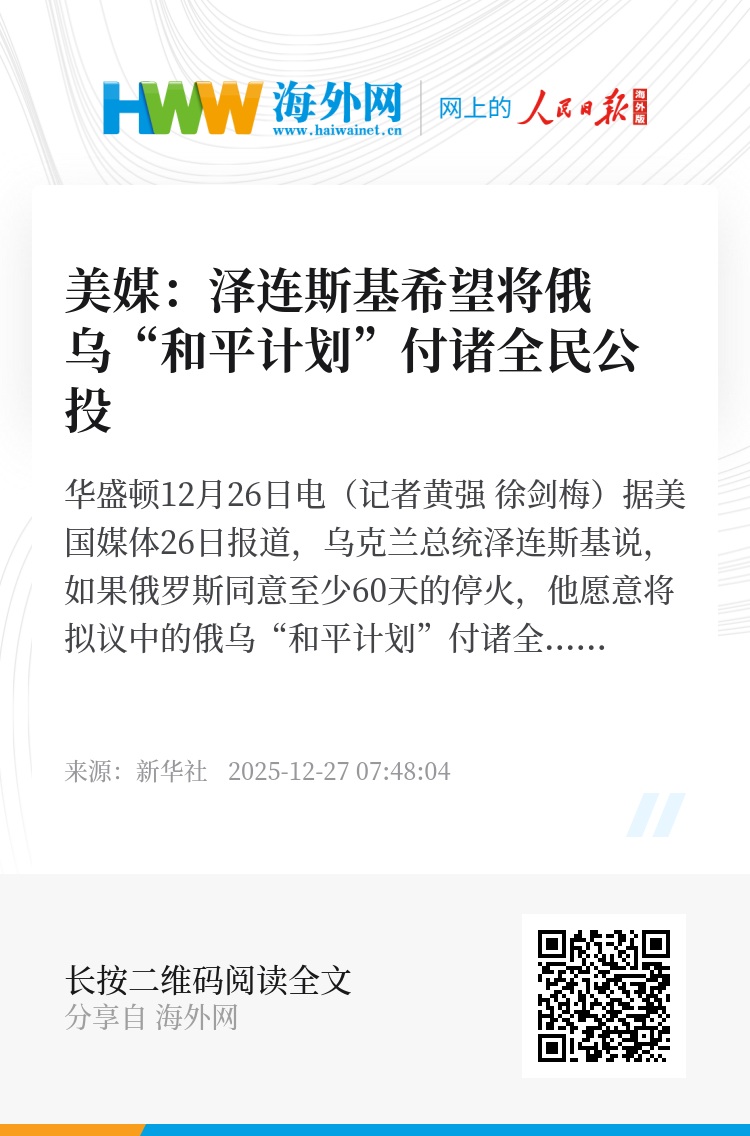新华社华盛顿12月26日电(记者黄强 徐剑梅)据美国媒体26日报道,乌克兰总统泽连斯基说,如果俄罗斯同意至少60天的停火,他愿意将拟议中的俄乌“和平计划”付诸全民公投。