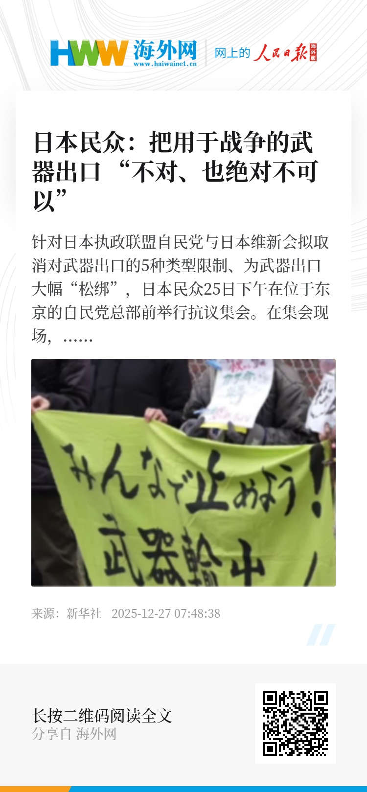 本月15日,日本自、维执政联盟召开会议,就修改“防卫装备转移三原则”运用指南、取消对武器出口的5种类型限制达成一致,并确认将于明年2月向内阁提交相关动议。该动向在日本国内引发强烈担忧和批评。(记者:陈泽安、杨智翔;视频:张淼)