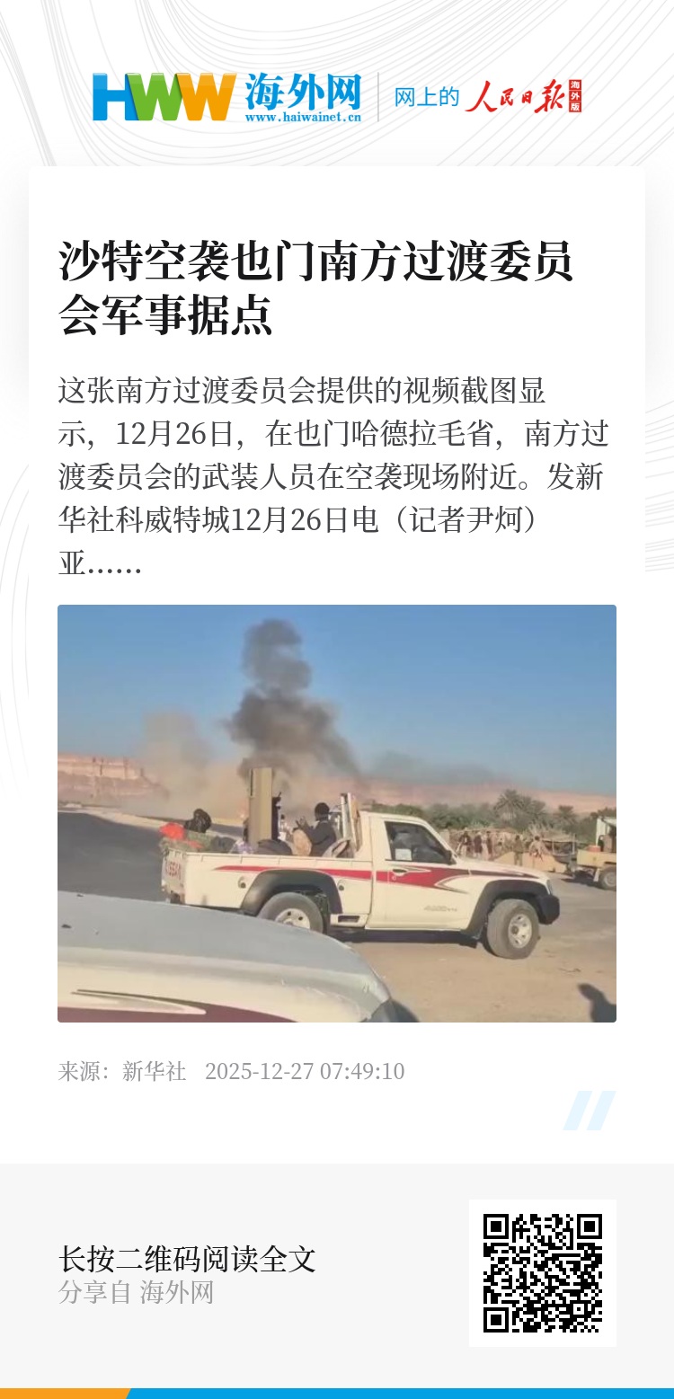 新华社科威特城12月26日电(记者尹炣)亚丁消息:据也门安全官员和当地媒体消息,沙特阿拉伯26日出动战机对也门东南部哈德拉毛省南方过渡委员会相关军事据点发动了空袭。