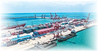 在山东省荣成市石岛新港口岸,满载跨境电商货物的外籍货轮在进行集装箱装卸作业。李信君摄(人民视觉)