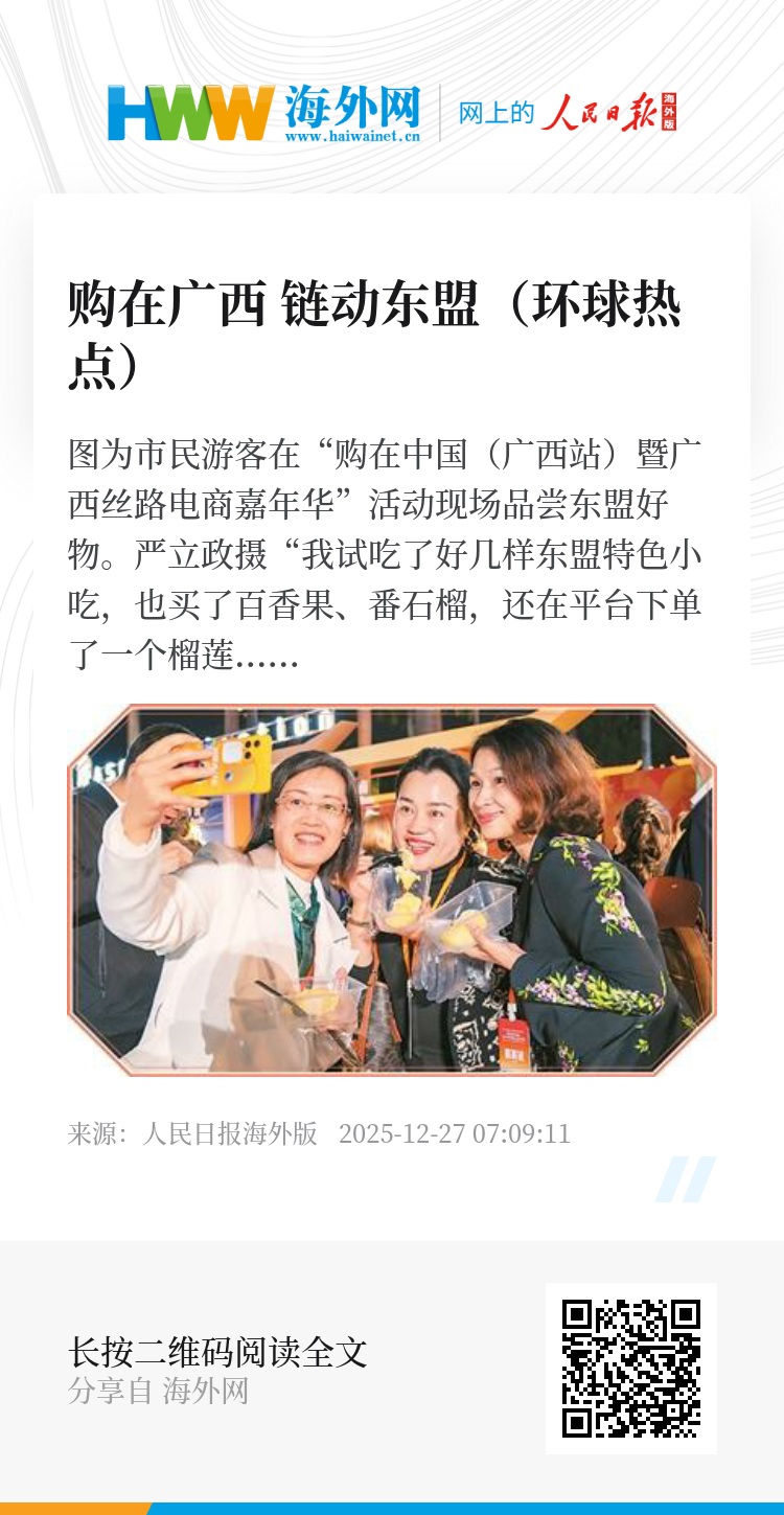 从数字政策赋能到与东盟人才互联,从“电商嘉年华”活动到携手各省份共进,广西正以更开放的姿态架起中国与东盟合作的桥梁,在共建“数字丝绸之路”中不断扩大高水平对外开放。(本报记者 李维俊 人民网记者 冯肖慧)