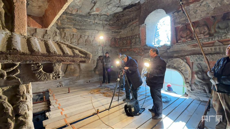 文保人员在洞窟里对造像进行拍摄存档(央广网记者 张晋鹏 摄)