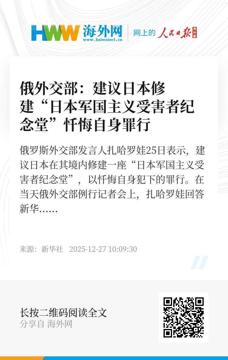 俄罗斯外交部发言人扎哈罗娃25日表示,建议日本在其境内修建一座“日本军国主义受害者纪念堂”,以忏悔自身犯下的罪行。
