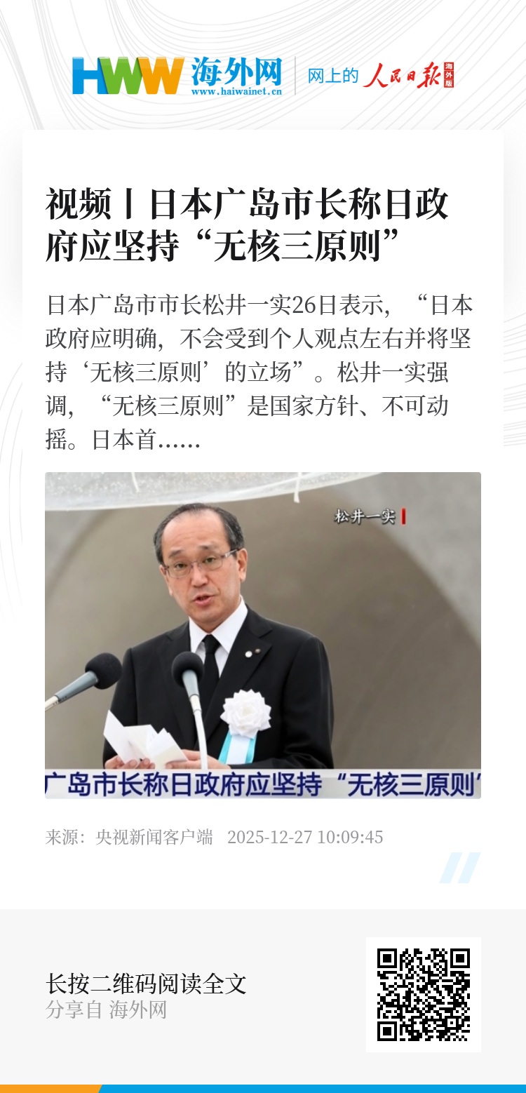 日本广岛市市长松井一实26日表示,“日本政府应明确,不会受到个人观点左右并将坚持‘无核三原则’的立场”。松井一实强调,“无核三原则”是国家方针、不可动摇。