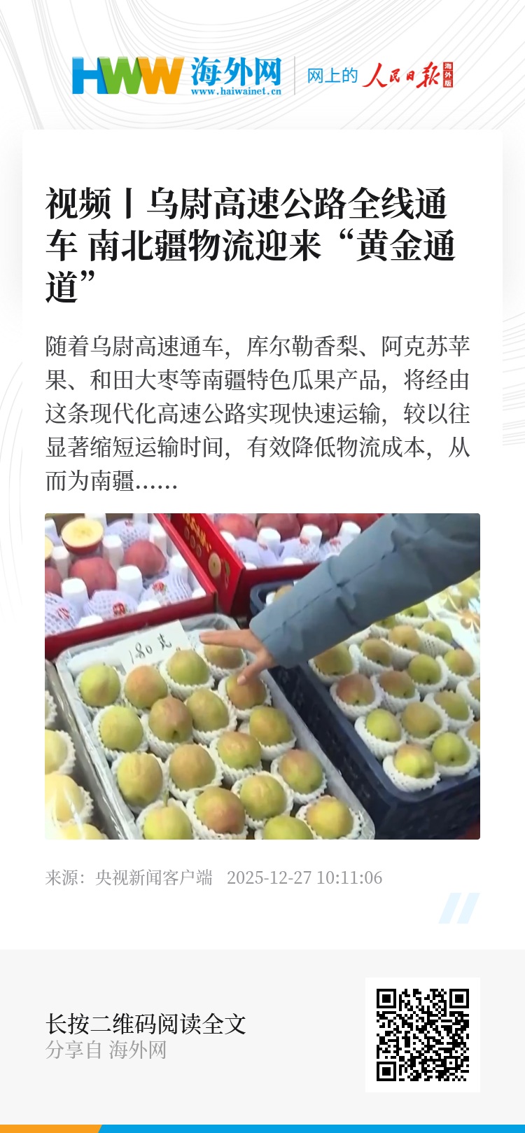 随着乌尉高速公路通车,这条“黄金通道”正以高效运输串联起天山南北的果园与市场,让新疆的甜蜜滋味更快走向全国。乌尉高速通车后,物流成本大幅下降,南北疆交通实现高效贯通,为货物运输和人员流动带来极大便利。