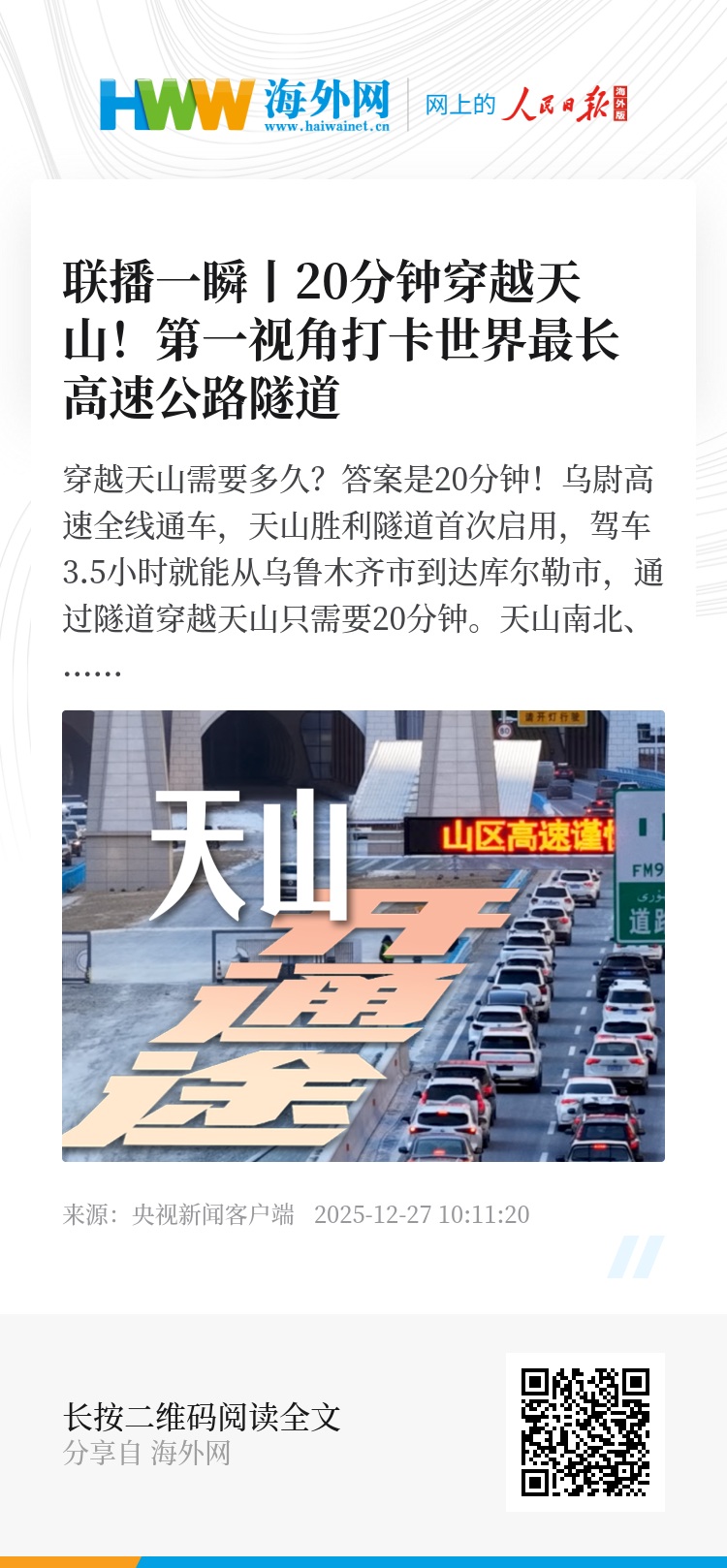 穿越天山需要多久?答案是20分钟!乌尉高速全线通车,天山胜利隧道首次启用,驾车3.5小时就能从乌鲁木齐市到达库尔勒市,通过隧道穿越天山只需要20分钟。天山南北、大美新疆,等你出发!