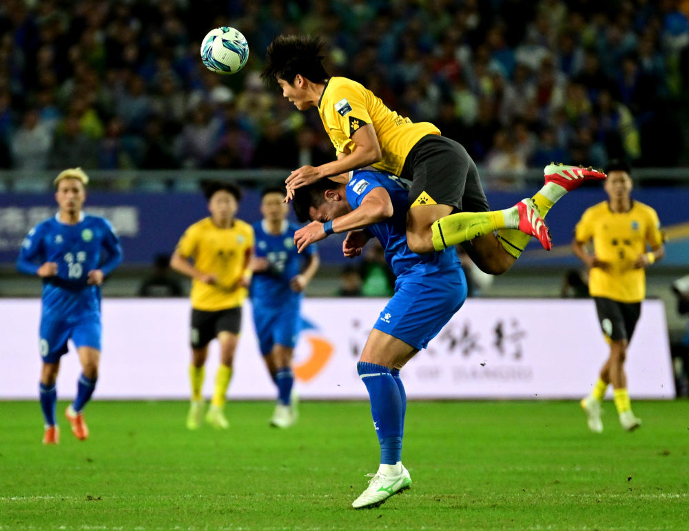 2025年10月18日,在“苏超”半决赛中,泰州队球员(上)与南京队球员争顶头球。新华社发(曹政 摄)