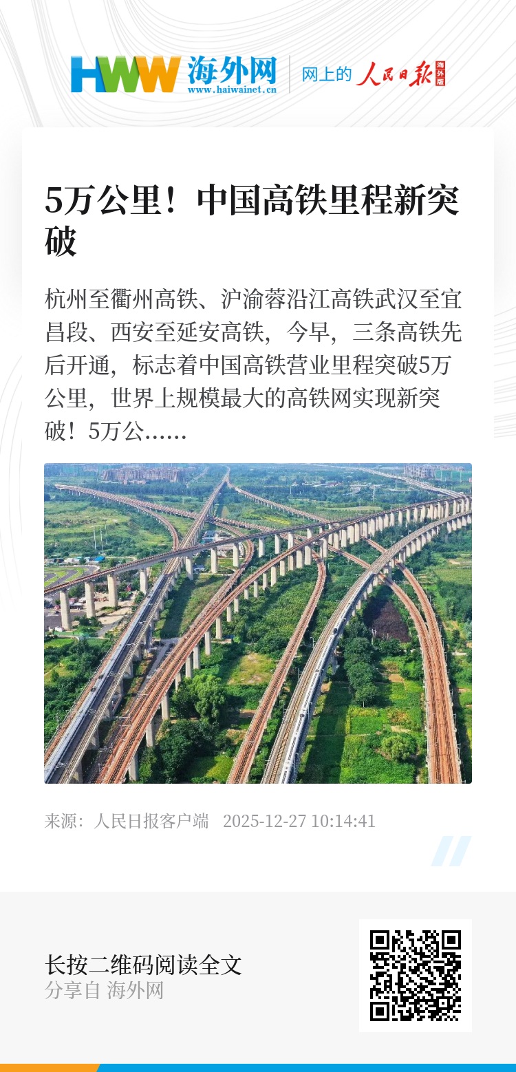 杭州至衢州高铁、沪渝蓉沿江高铁武汉至宜昌段、西安至延安高铁,今早,三条高铁先后开通,标志着中国高铁营业里程突破5万公里,世界上规模最大的高铁网实现新突破!