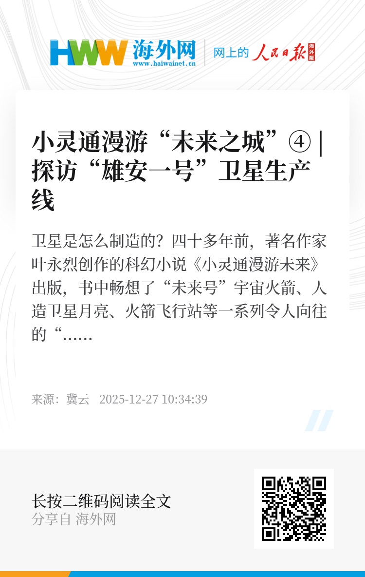 卫星是怎么制造的?四十多年前,著名作家叶永烈创作的科幻小说 《小灵通漫游未来》出版,书中畅想了“未来号”宇宙火箭、人造卫星月亮、火箭飞行站等一系列令人向往的“未来场景”。四十多年后,书中主人公小灵通来到“未来之城”雄安新区,与城市IP“小雄”“小安”一起,实地探访“雄安一号”卫星生产线。