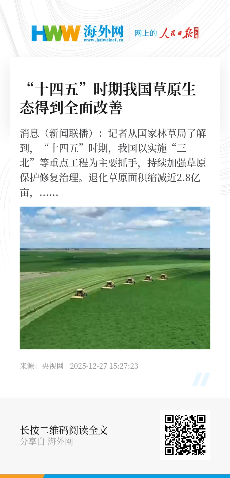 央视网消息(新闻联播):记者从国家林草局了解到,“十四五”时期,我国以实施“三北”等重点工程为主要抓手,持续加强草原保护修复治理。退化草原面积缩减近2.8亿亩,年均防治草原有害生物超1亿亩,草原综合植被盖度保持在50%以上,健康和亚健康草原面积增加到27亿亩,占比超七成,全国草原生态状况实现了由本世纪初“整体恶化”到当前“全面改善”的历史性转变。