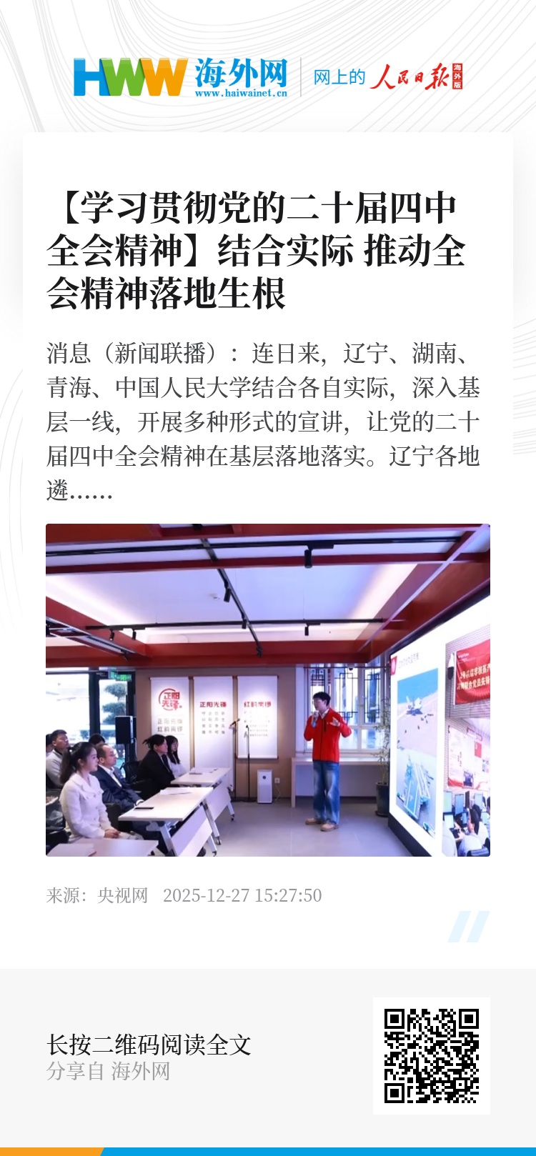 央视网消息(新闻联播):连日来,辽宁、湖南、青海、中国人民大学结合各自实际,深入基层一线,开展多种形式的宣讲,让党的二十届四中全会精神在基层落地落实。