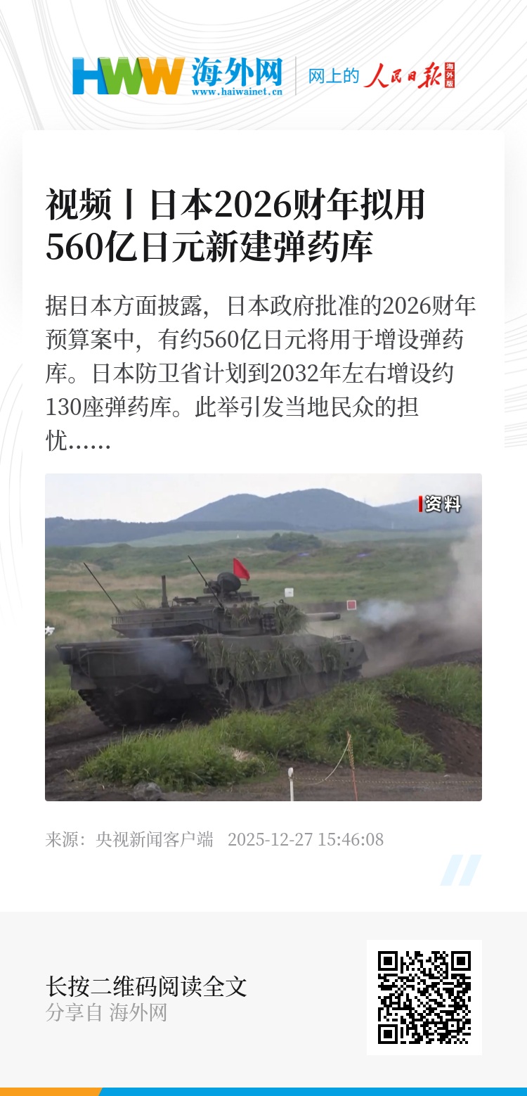 据日本方面披露,日本政府批准的2026财年预算案中,有约560亿日元将用于增设弹药库。日本防卫省计划到2032年左右增设约130座弹药库。此举引发当地民众的担忧和反对。