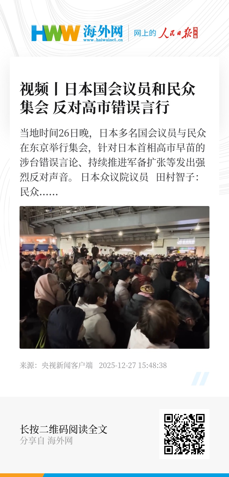 当地时间26日晚,日本多名国会议员与民众在东京举行集会,针对日本首相高市早苗的涉台错误言论、持续推进军备扩张等发出强烈反对声音。