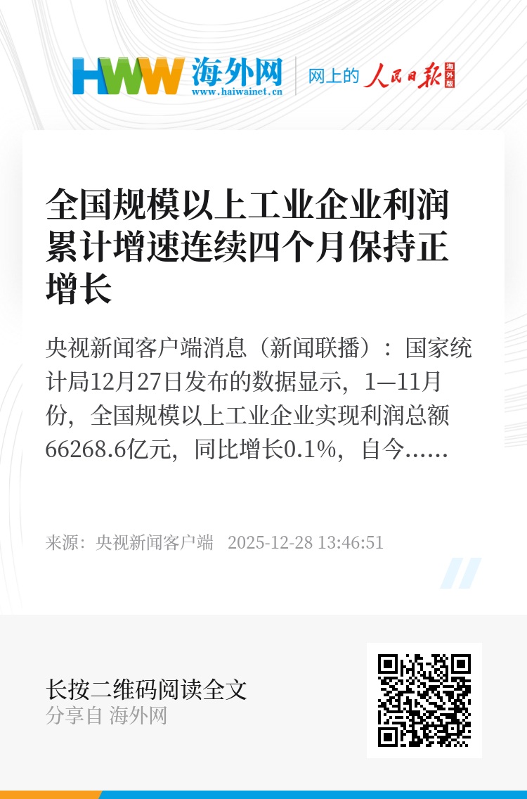 央视新闻客户端消息(新闻联播):国家统计局12月27日发布的数据显示,1—11月份,全国规模以上工业企业实现利润总额66268.6亿元,同比增长0.1%,自今年8月份以来累计增速连续四个月保持增长。