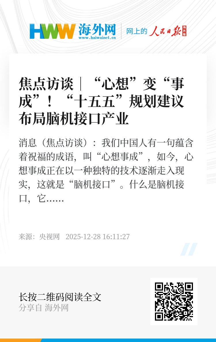 央视网消息(焦点访谈):我们中国人有一句蕴含着祝福的成语,叫“心想事成”,如今,心想事成正在以一种独特的技术逐渐走入现实,这就是“脑机接口”。什么是脑机接口,它又能干什么呢?打个比方,如果有人中枢神经受了损伤,不能控制手的动作,那么借助脑机接口技术就可以辅助手部实现抓握,恢复患者手部功能;下肢运动功能障碍患者,可以用脑机接口控制外骨骼,重新行走……这些以前只能是想象中的画面正在现实中真实上演,依靠的正是脑机接口技术。“十五五”规划建议中明确提出脑机接口是六大未来产业之一,成为新的经济增长点。这将进一步推动脑机接口从实验室走向产业化,在科技加持下“心想”正在“事成”。