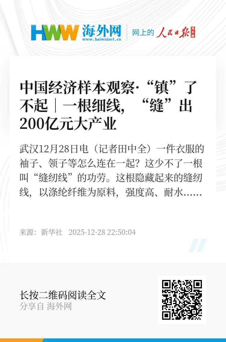 新华社武汉12月28日电(记者田中全)一件衣服的袖子、领子等怎么连在一起?这少不了一根叫“缝纫线”的功劳。这根隐藏起来的缝纫线,以涤纶纤维为原料,强度高、耐水洗,能保障多块布料缝合后的牢固度。