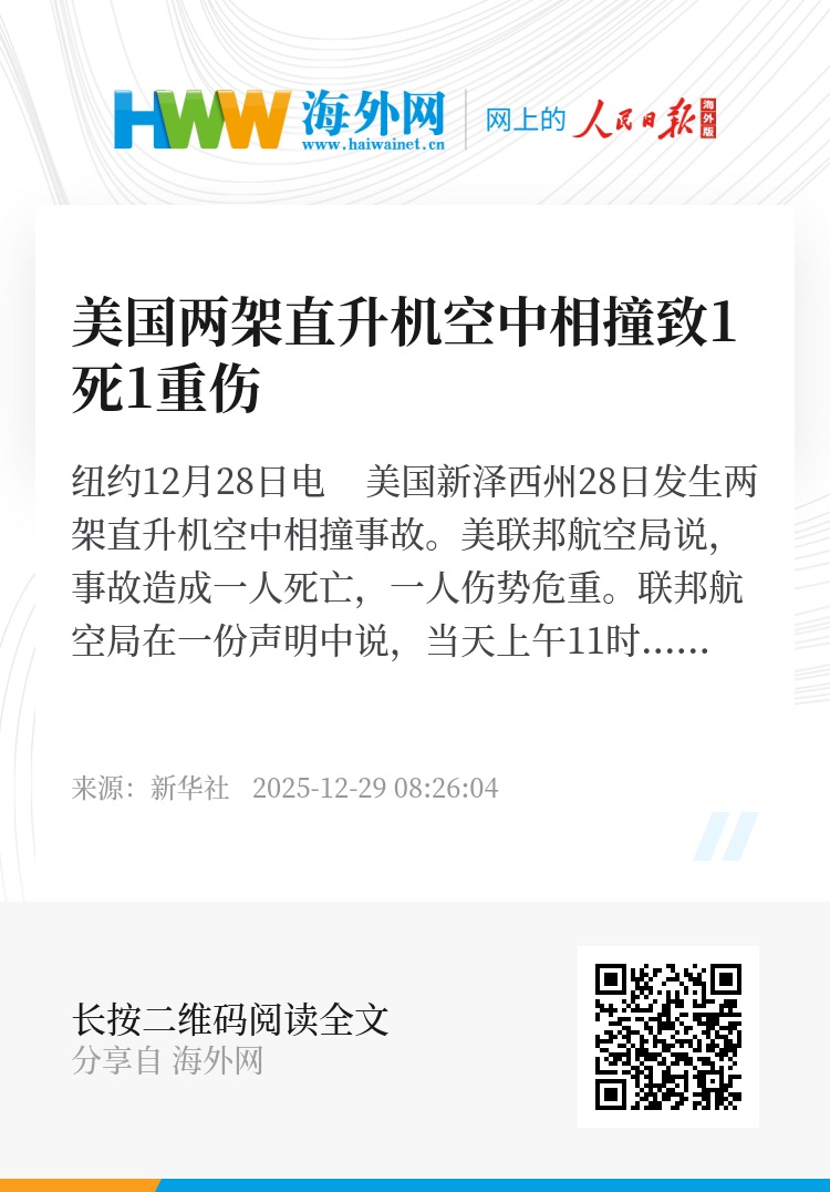新华社纽约12月28日电 美国新泽西州28日发生两架直升机空中相撞事故。美联邦航空局说,事故造成一人死亡,一人伤势危重。