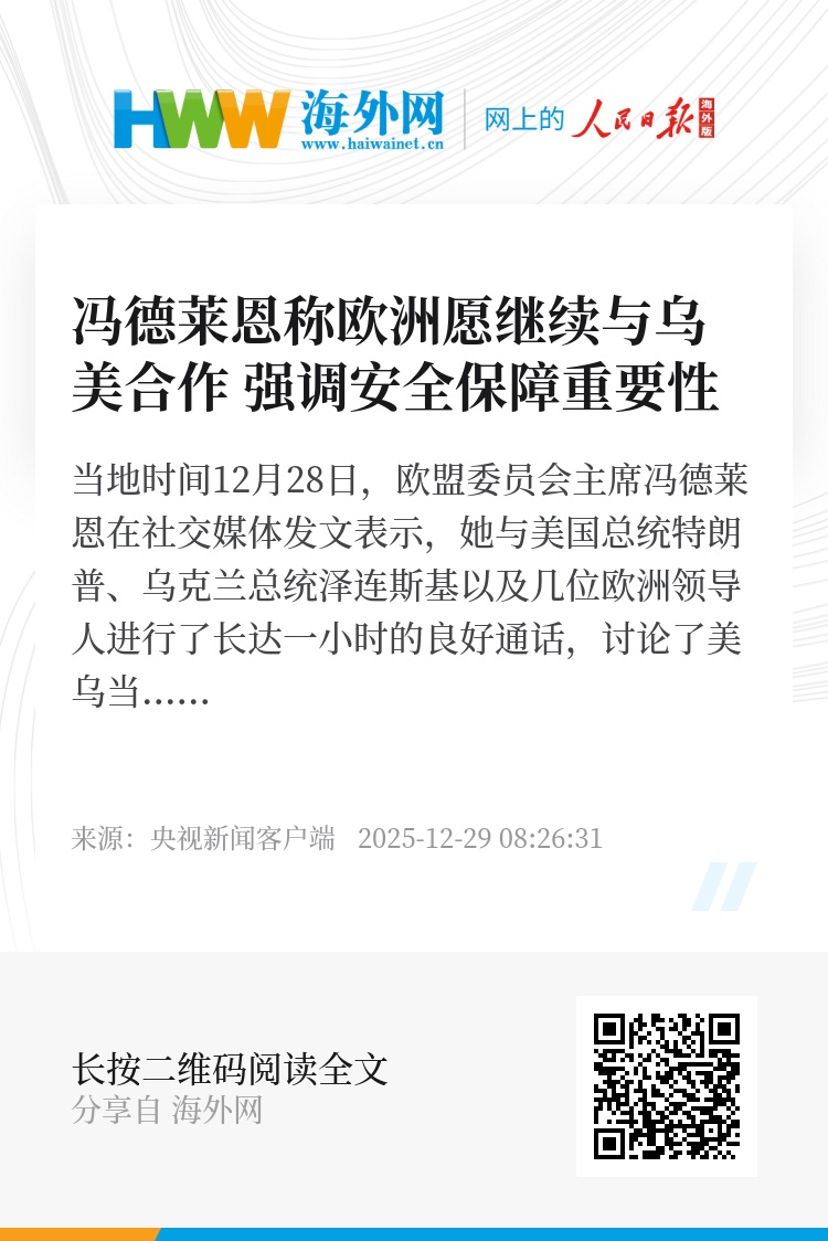 当地时间12月28日,欧盟委员会主席冯德莱恩在社交媒体发文表示,她与美国总统特朗普、乌克兰总统泽连斯基以及几位欧洲领导人进行了长达一小时的良好通话,讨论了美乌当天就俄乌问题举行的会晤。