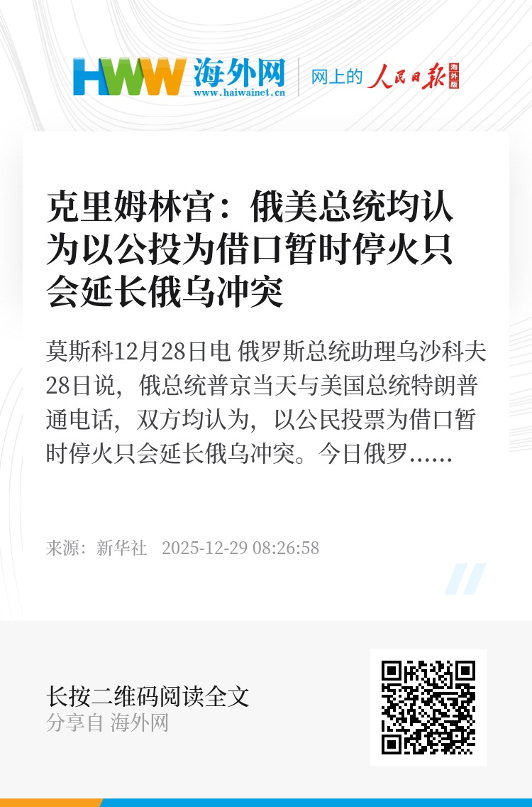新华社莫斯科12月28日电 俄罗斯总统助理乌沙科夫28日说,俄总统普京当天与美国总统特朗普通电话,双方均认为,以公民投票为借口暂时停火只会延长俄乌冲突。