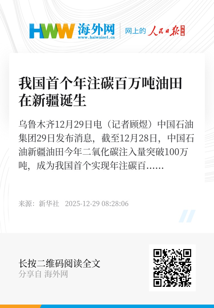 新华社乌鲁木齐12月29日电(记者顾煜)中国石油集团29日发布消息,截至12月28日,中国石油新疆油田今年二氧化碳注入量突破100万吨,成为我国首个实现年注碳百万吨的油田。这标志着新疆油田在CCUS(碳捕集、利用与封存)技术规模化应用上迈出关键一步,为我国油气开采实现碳达峰、碳中和目标提供了重要技术支撑与实践路径。