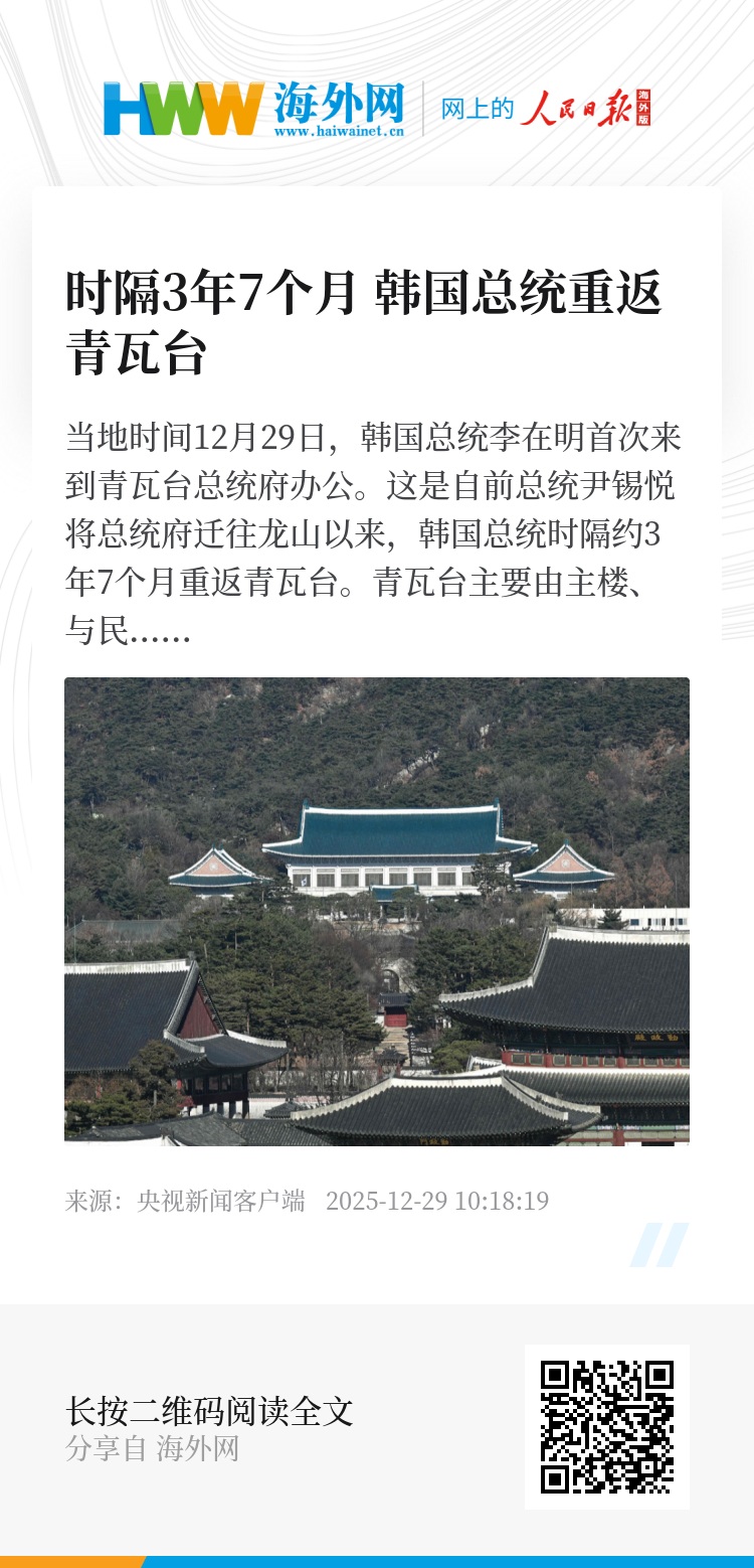 当地时间12月29日,韩国总统李在明首次来到青瓦台总统府办公。这是自前总统尹锡悦将总统府迁往龙山以来,韩国总统时隔约3年7个月重返青瓦台。