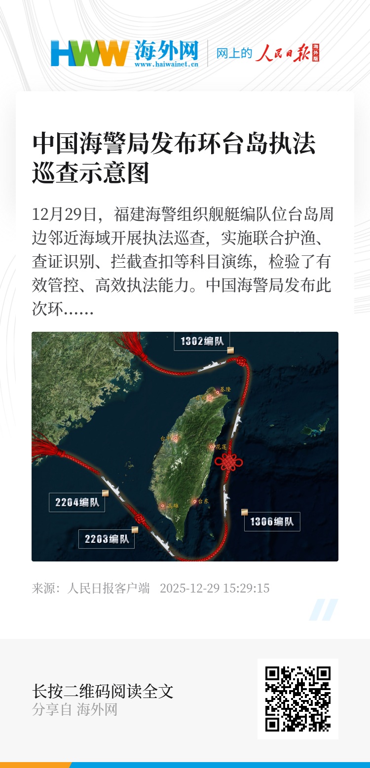 12月29日,福建海警组织舰艇编队位台岛周边邻近海域开展执法巡查,实施联合护渔、查证识别、拦截查扣等科目演练,检验了有效管控、高效执法能力。