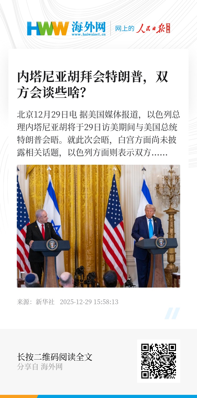 新华社北京12月29日电 据美国媒体报道,以色列总理内塔尼亚胡将于29日访美期间与美国总统特朗普会晤。就此次会晤,白宫方面尚未披露相关话题,以色列方面则表示双方将讨论加沙停火第二阶段事宜、黎巴嫩真主党议题。此外,媒体报道则称,以方可能知会美方,以或再次打击伊朗。