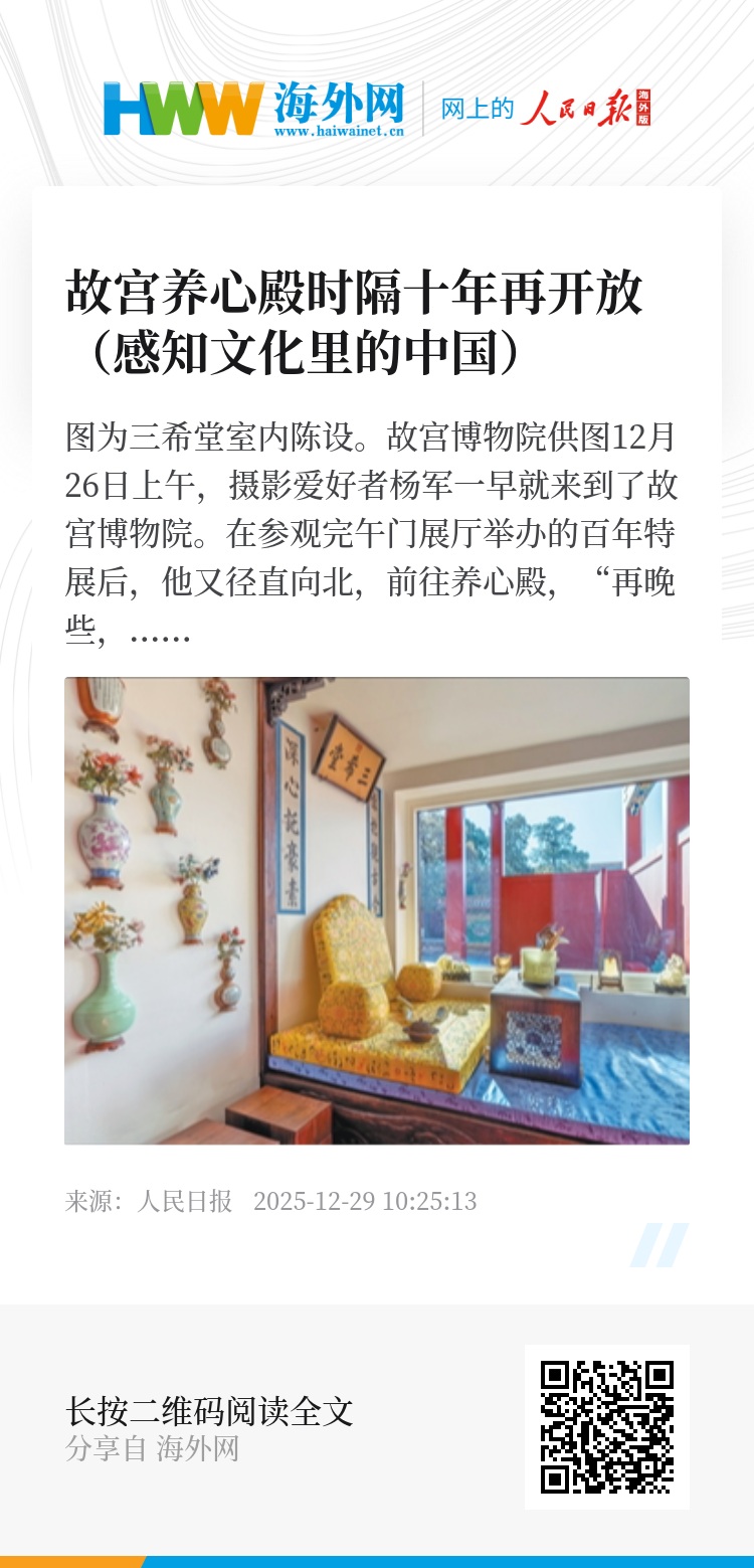 十年修一殿,养心殿蕴藏着文明的厚度与匠心的温度,它不仅再现了历史时空里的多彩细节,更见证着中华优秀传统文化传承发展的鲜活气象。(记者 王珏)
