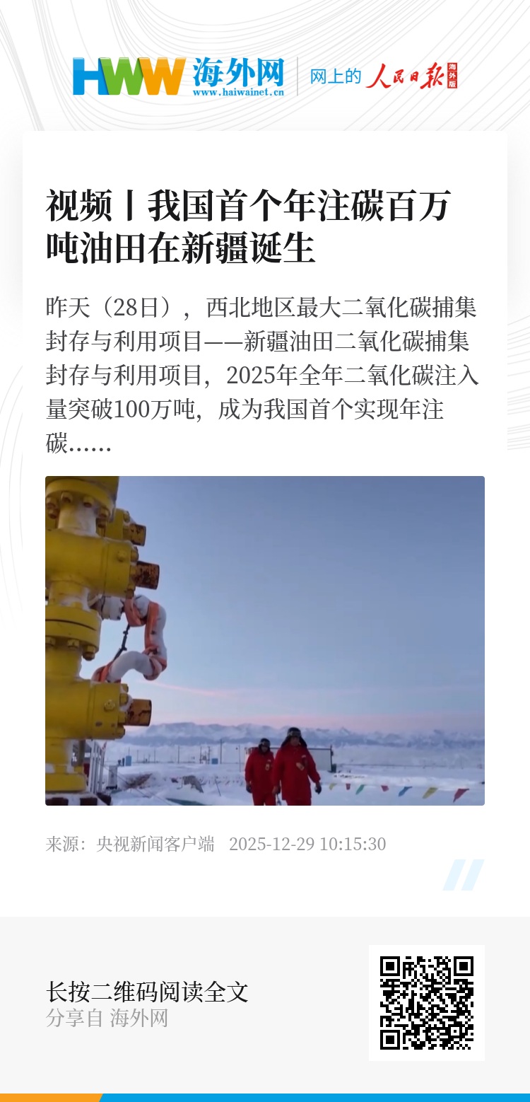 昨天(28日),西北地区最大二氧化碳捕集封存与利用项目——新疆油田二氧化碳捕集封存与利用项目,2025年全年二氧化碳注入量突破100万吨,成为我国首个实现年注碳百万吨级的油田,标志着我国二氧化碳捕集封存与规模化应用迈出重要一步。