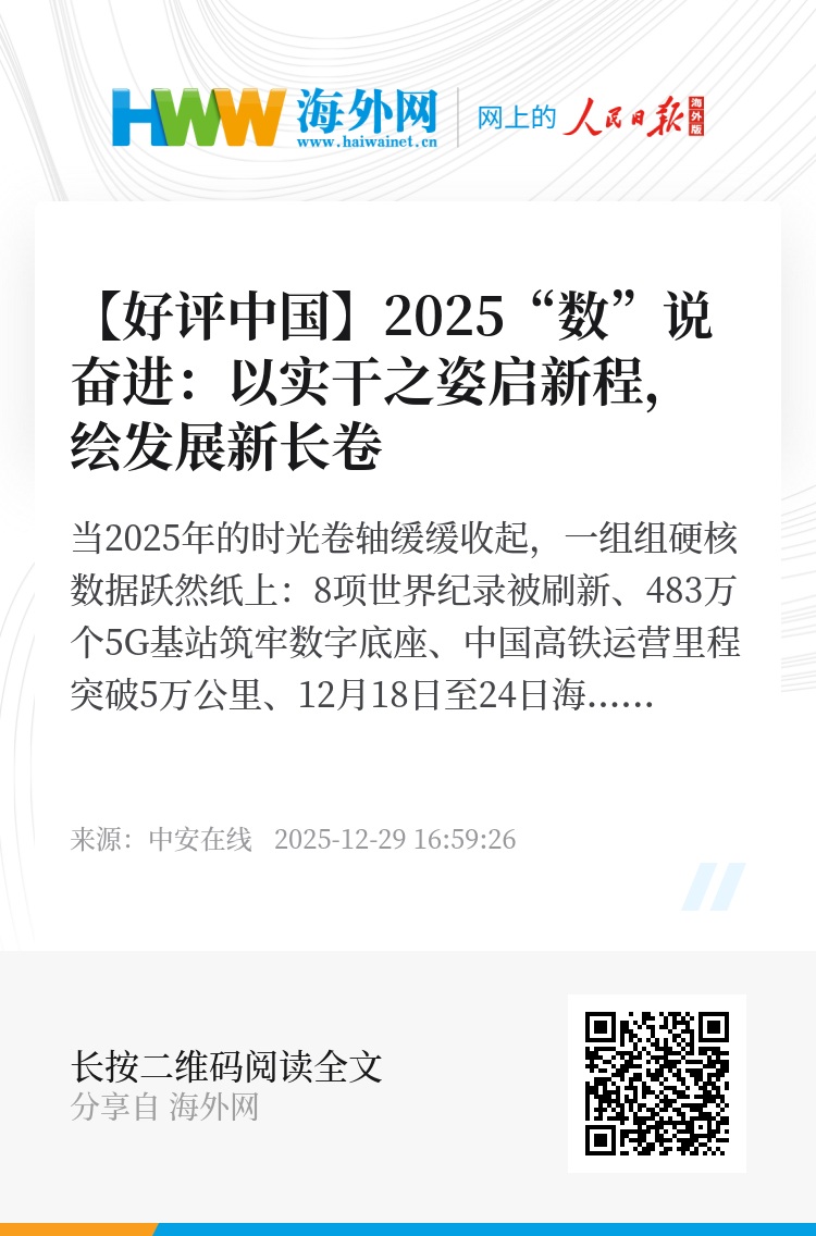 数说2025,是成就的总结,更是奋进的起点。每一个亮眼数据的背后,都是实干的积累;每一份发展成就的取得,都离不开奋斗的支撑。新的征程上,无需仰望星空空想,只需脚踏实地实干。让我们以“数”据为激励,以实干为路径,在创新中突破、在为民中坚守、在协同中奋进,用更多实打实的成绩、更亮眼的数字,书写属于中国的下一个精彩篇章!