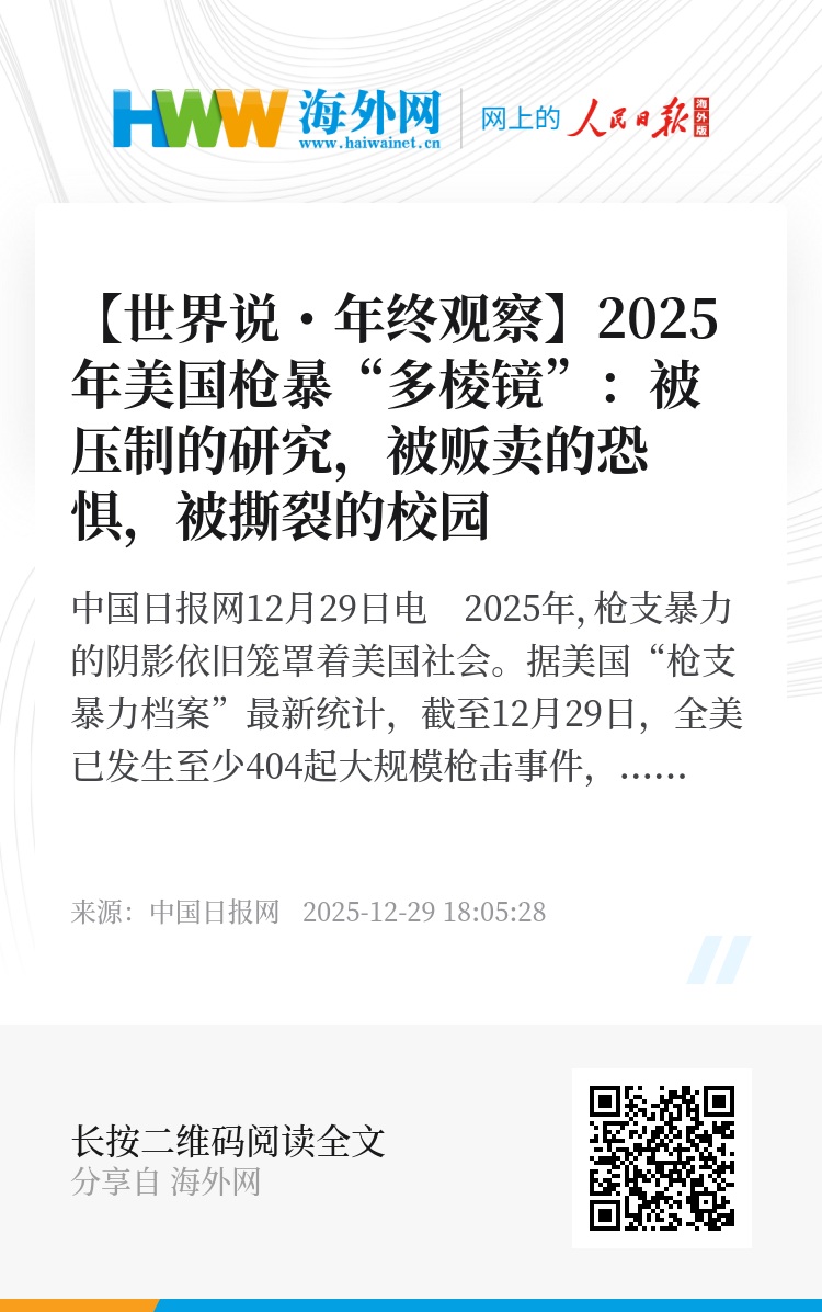中国日报网12月29日电 2025年,枪支暴力的阴影依旧笼罩着美国社会。据美国“枪支暴力档案”最新统计,截至12月29日,全美已发生至少404起大规模枪击事件,虽较2021年至少690起的峰值有所回落,但数字依然触目惊心。从研究受阻、行业隐秘操作到犯罪枪支的快速流转,这份沉重数据背后的一系列事件揭示了美国正深陷一场复杂且严重的公共卫生与安全危机。