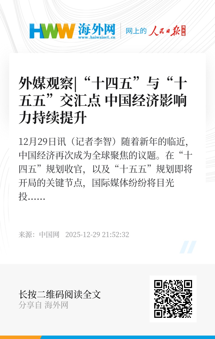 中国网12月29日讯(记者李智)随着新年的临近,中国经济再次成为全球聚焦的议题。在“十四五”规划收官,以及“十五五”规划即将开局的关键节点,国际媒体纷纷将目光投向中国。与此同时,国内相关政策的密集落地,也为市场释放出清晰的发展信号。