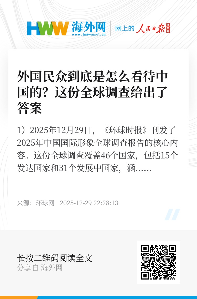 1)2025年12月29日,《环球时报》刊发了2025年中国国际形象全球调查报告的核心内容。这份全球调查覆盖46个国家,包括15个发达国家和31个发展中国家,涵盖各大洲代表性国家及G20国家、9个金砖国家、10个东盟国家,共收集了5.17万份有效样本。它是一份符合国际标准,调查对象具有广泛代表性,比较严谨、科学的全球调查。这项调查得出了一个清晰的结论:随着中国式现代化不断取得新的进展,随着中国不断为全球治理贡献中国方案、中国智慧,中国的国际形象不断提升,中国的国际认可度不断增加。“得道多助”,这句中国老话里蕴藏的智慧,在当代国际关系中得到了生动印证。