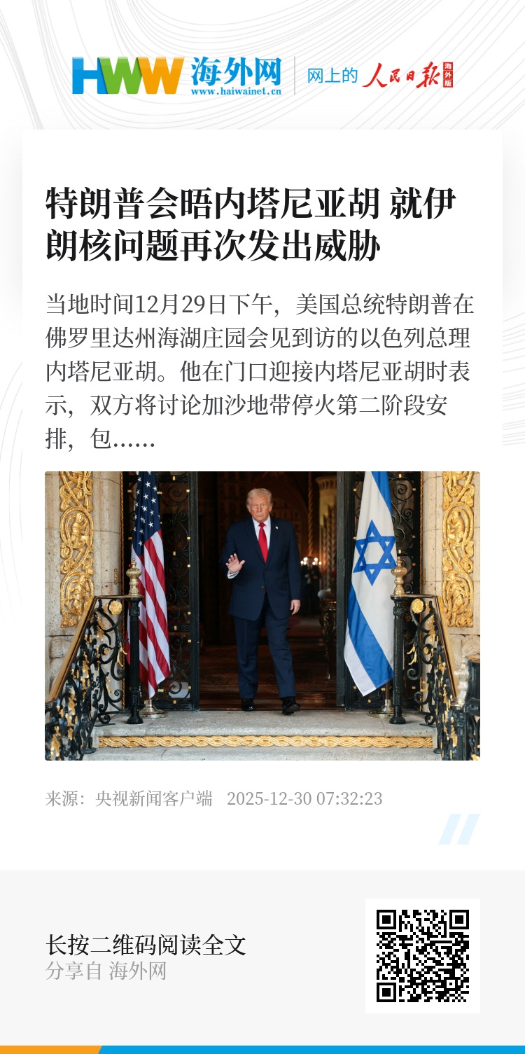 今年6月,以色列和美国袭击伊朗核设施。近来又有报道称,以色列政府准备了一份“关于伊朗的综合情报档案”,内塔尼亚胡此访将提交给美国,并告知特朗普“以色列可能再次打击伊朗军事设施”。(央视记者 吴汉婴)