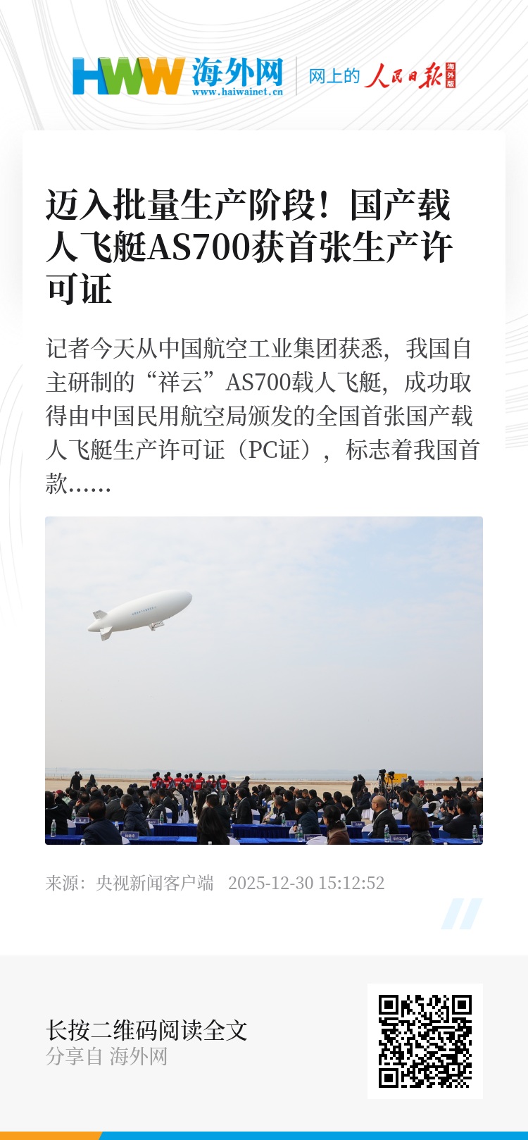 记者今天从中国航空工业集团获悉,我国自主研制的“祥云”AS700载人飞艇,成功取得由中国民用航空局颁发的全国首张国产载人飞艇生产许可证(PC证),标志着我国首款按适航标准自主研制的载人飞艇正式迈入批量生产阶段,为国产载人飞艇规模化交付和商业化运营奠定了坚实基础。