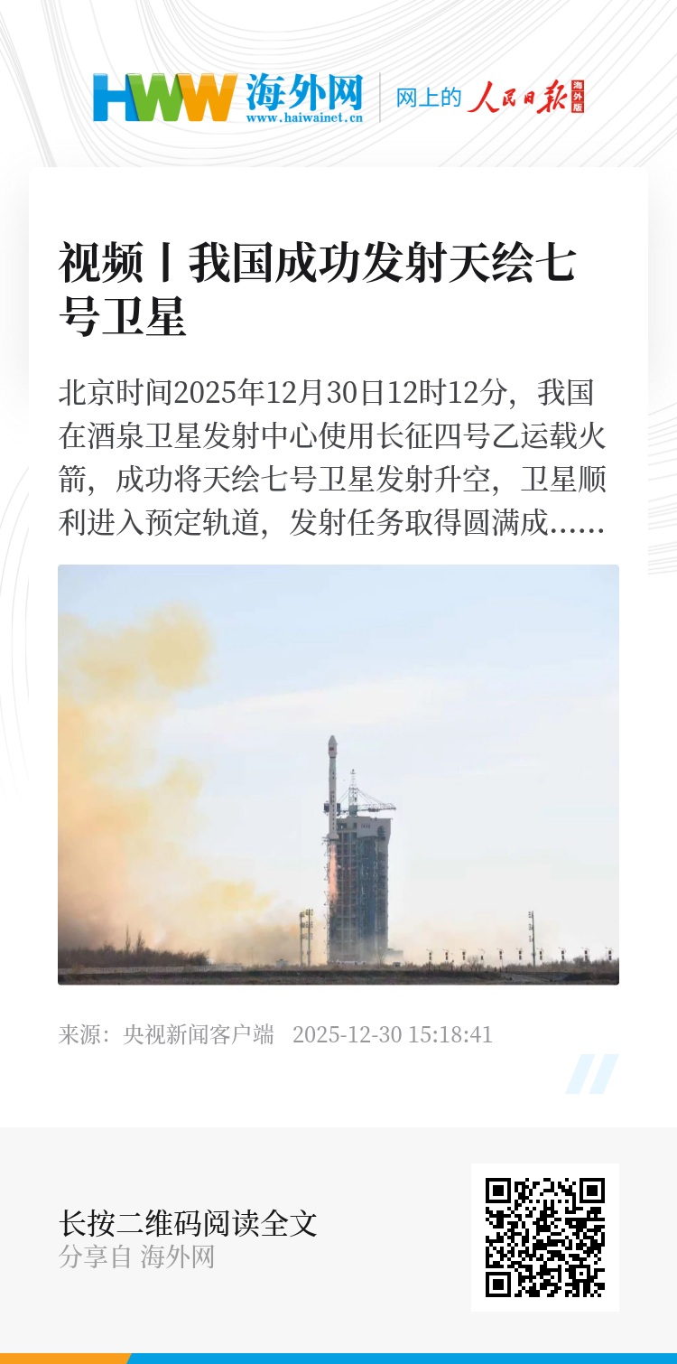 北京时间2025年12月30日12时12分,我国在酒泉卫星发射中心使用长征四号乙运载火箭,成功将天绘七号卫星发射升空,卫星顺利进入预定轨道,发射任务取得圆满成功。该卫星主要用于地理信息测绘、国土资源普查和科学试验研究等任务。