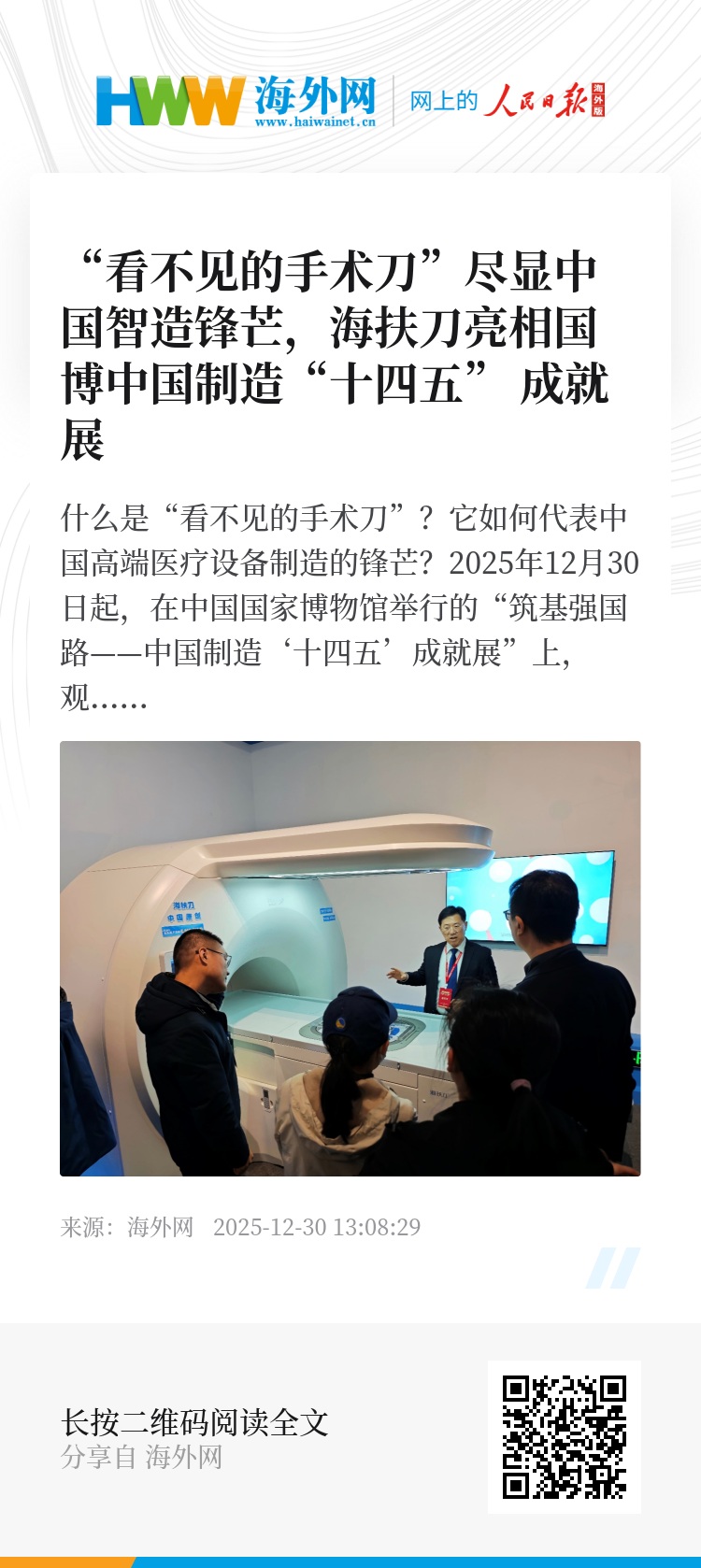 什么是“看不见的手术刀”?它如何代表中国高端医疗设备制造的锋芒?2025年12月30日起,在中国国家博物馆举行的“筑基强国路——中国制造‘十四五’成就展”上,观众将找到答案。我国具有完全自主知识产权的海扶刀®聚焦超声肿瘤治疗系统(JC300)作为高端医疗装备的代表性成果,与众多国之重器同台展出,向世界展示“中国智造”守护人民健康的硬核实力与温情。