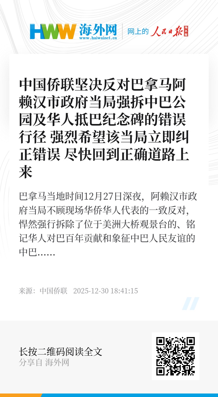巴拿马当地时间12月27日深夜,阿赖汉市政府当局不顾现场华侨华人代表的一致反对,悍然强行拆除了位于美洲大桥观景台的、铭记华人对巴百年贡献和象征中巴人民友谊的中巴公园及华人抵巴150周年纪念碑。对此,12月29日上午,中国驻巴拿马大使馆发布严正声明,表示极度震惊、强烈愤慨和坚决反对;中国外交部发言人当日下午郑重表示,中方对巴拿马有关地方政府强拆华人抵巴纪念碑行径严重不满,已向巴方提出严正交涉。中国侨联完全同意、坚定支持上述表态。